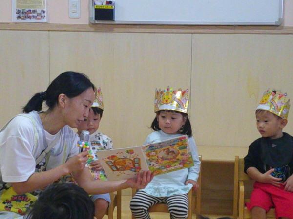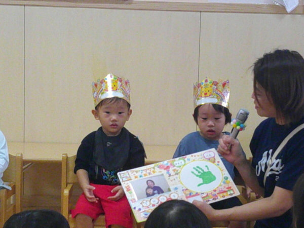 先ずは誕生児の紹介です。お家の人からのお祝いメッセージを先生に呼んでもらって嬉しそうですね。
