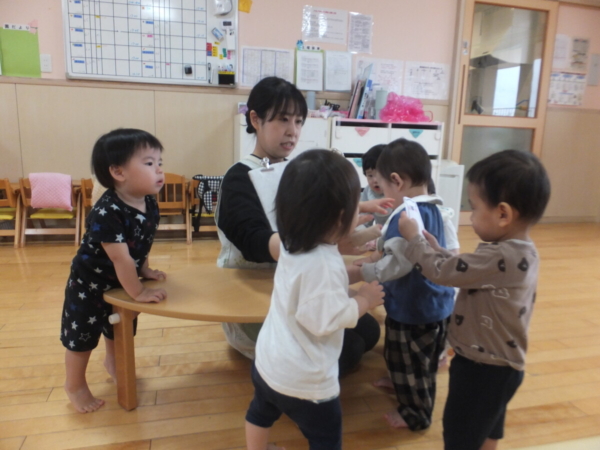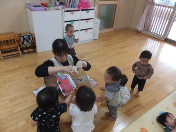 0歳児はお楽しみシアターで変身ボックスをしました。
