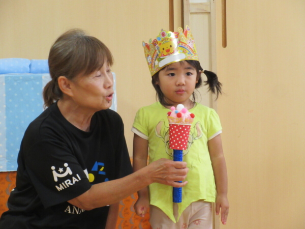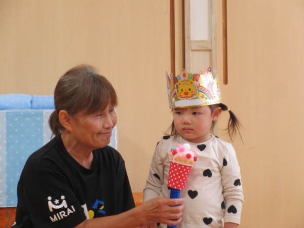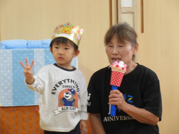 先ずは誕生児の紹介です。お家の人からのお祝いメッセージを先生に呼んでもらって嬉しそうですね。