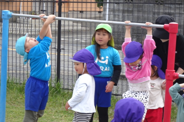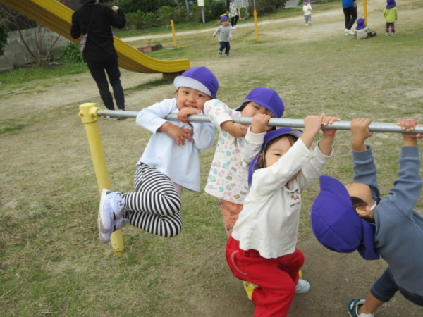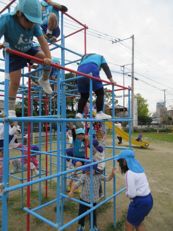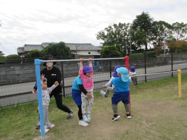 公園では鉄棒やジャングルジム、滑り台。年長さんはおいかけっこを楽しみました。