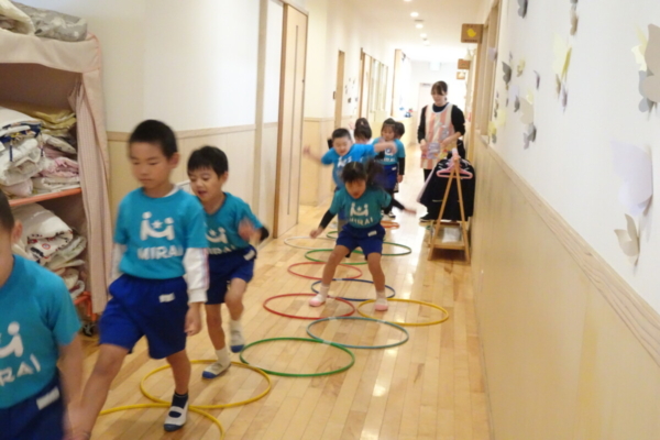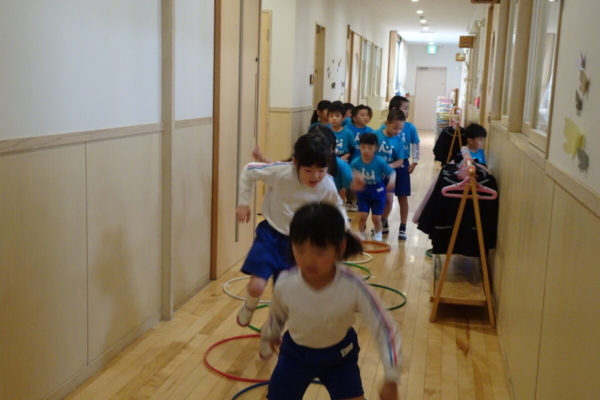 園に戻って来ると、廊下に出ると年中さんが「海賊ごっこ」をしていました。