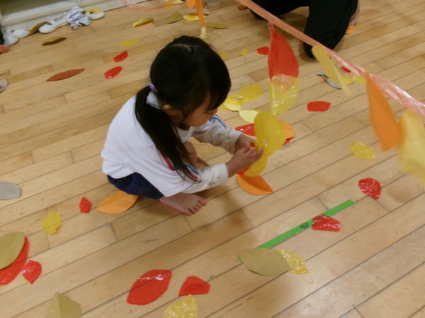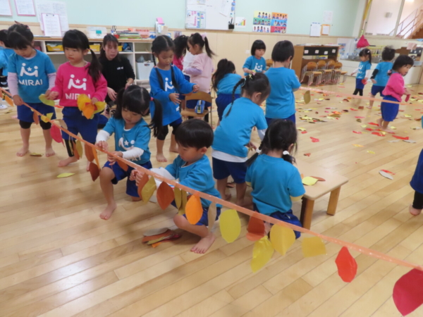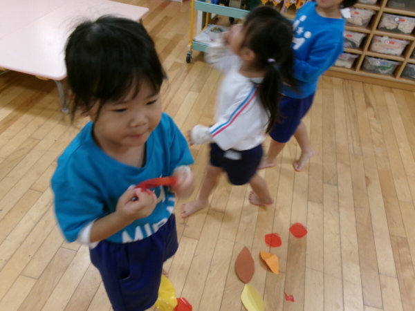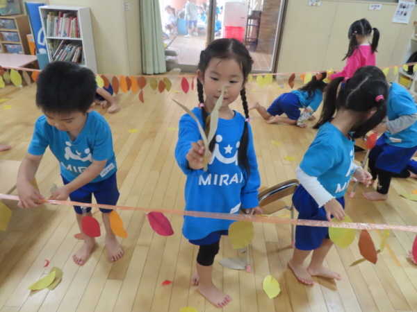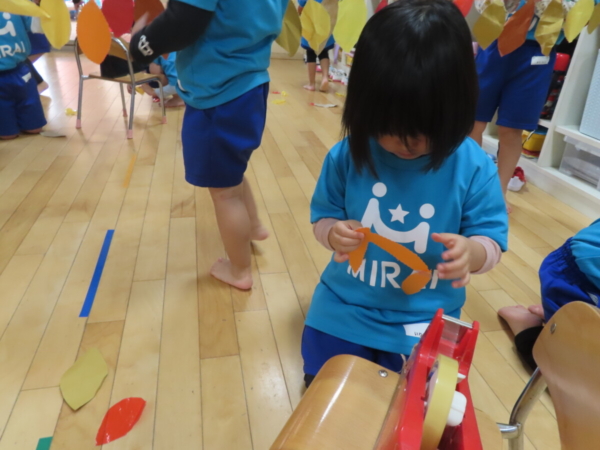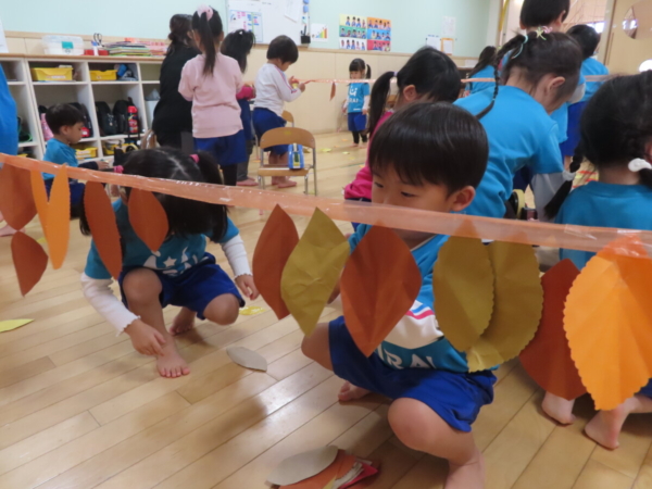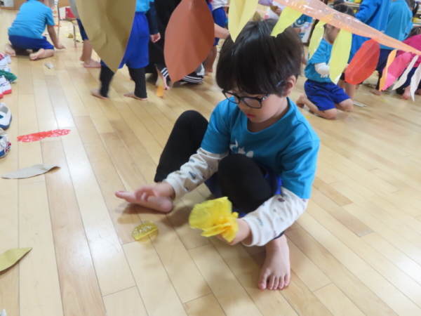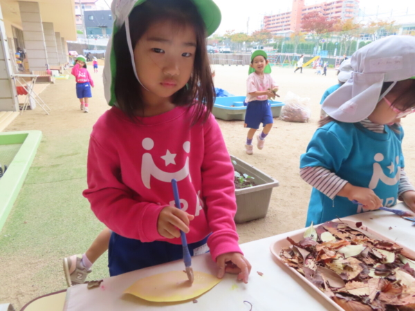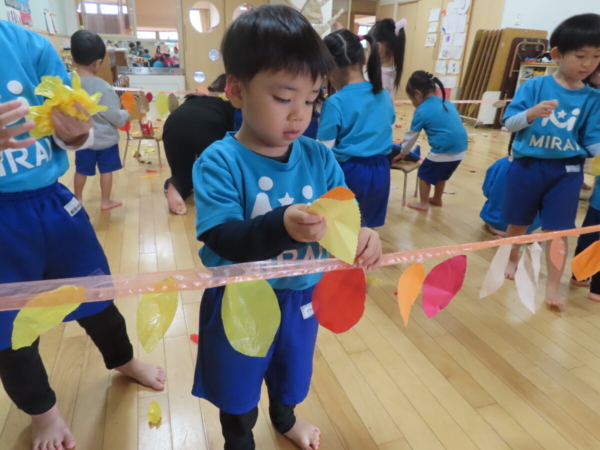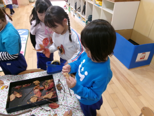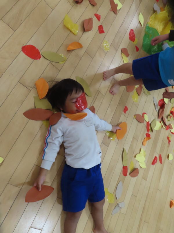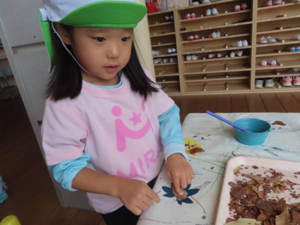 思い切り楽しんだ後は、全集中で葉っぱを貼り付けていきます・・・🍃つけていくうちに「うさぎに見えた!」「きつねみたい!」「ハートだよ!」いろんなものに見立て始めました🎵こどもたちの発想力には感心させられます・・・