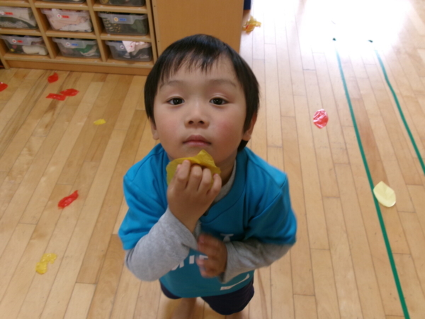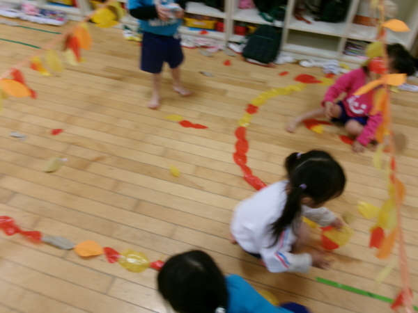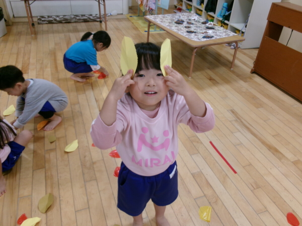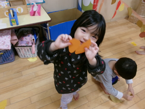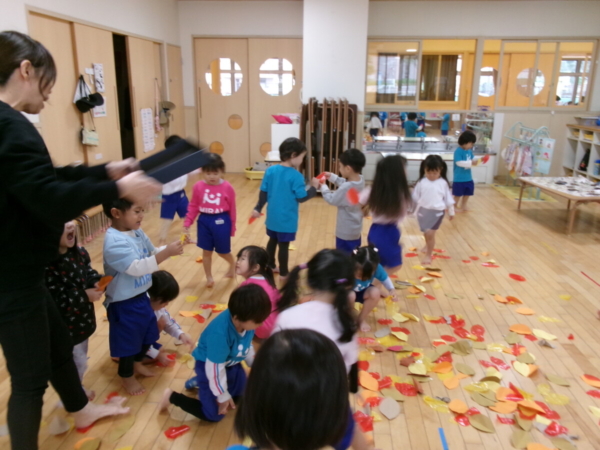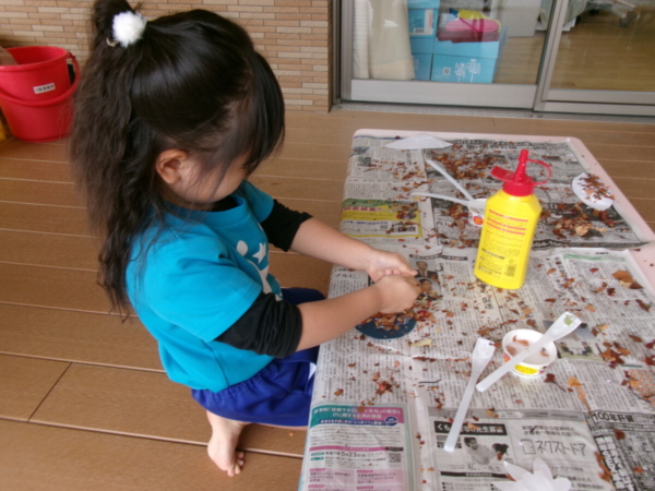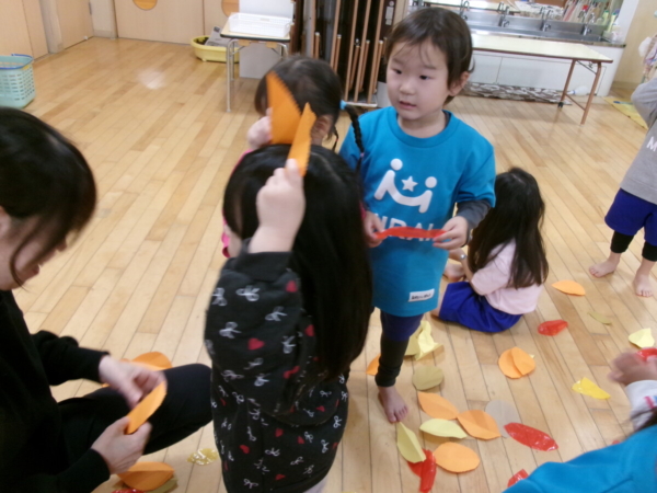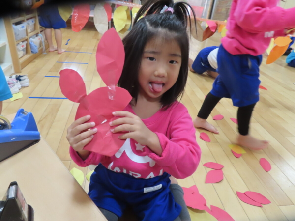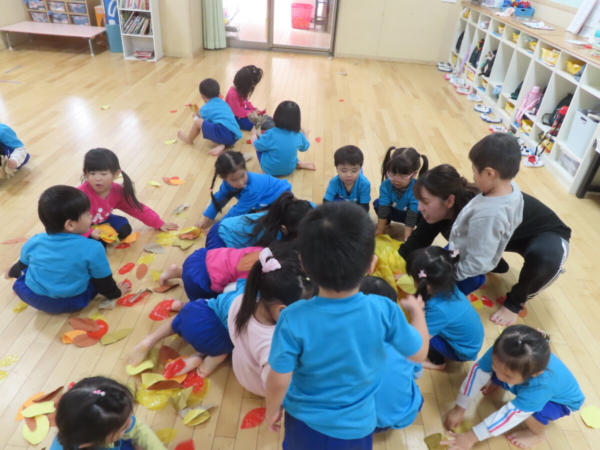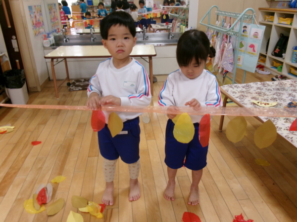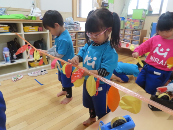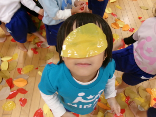 思い切り楽しんだ後は、全集中で葉っぱを貼り付けていきます・・・🍃つけていくうちに「うさぎに見えた!」「きつねみたい!」「ハートだよ!」いろんなものに見立て始めました🎵こどもたちの発想力には感心させられます・・・