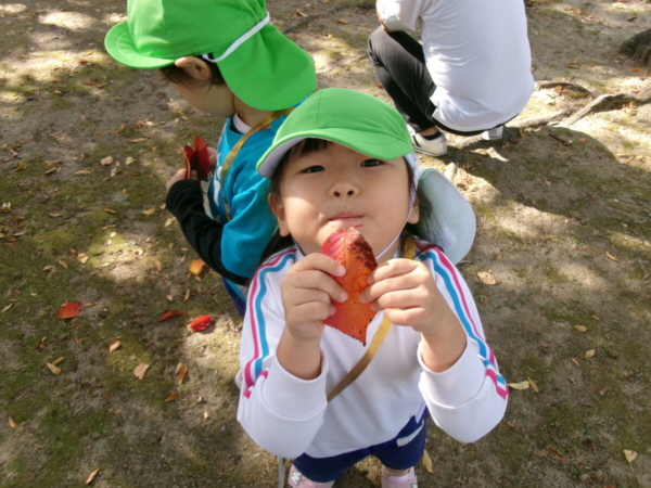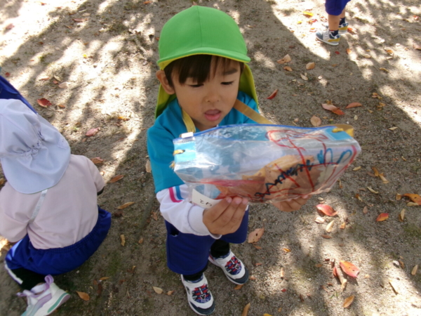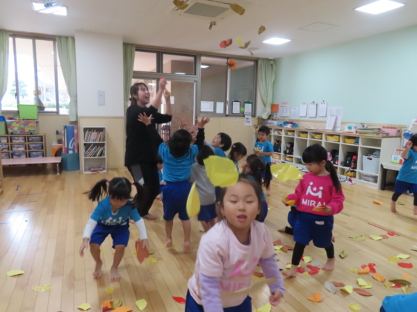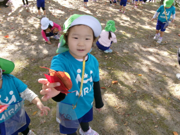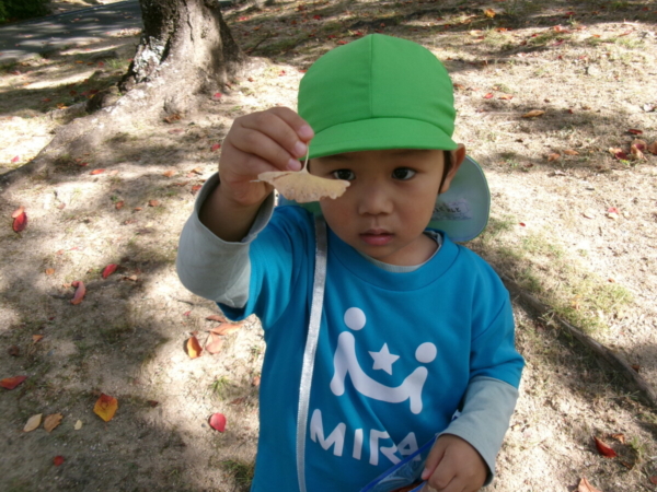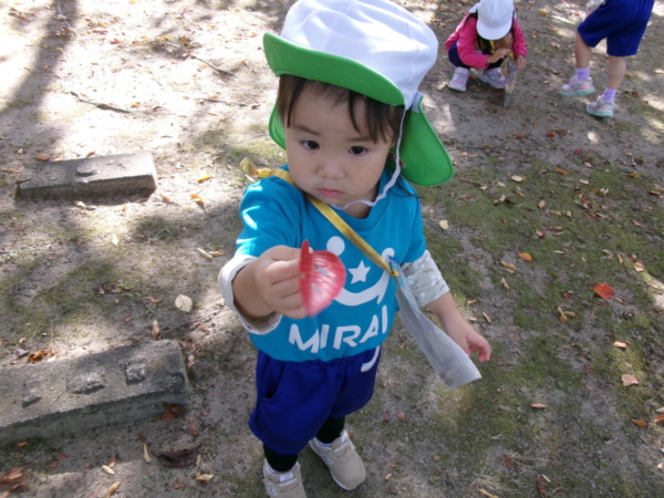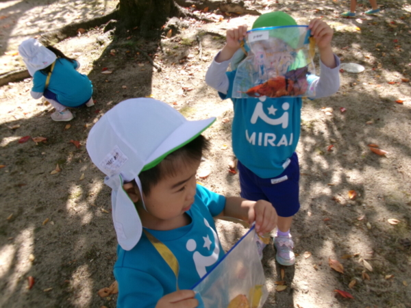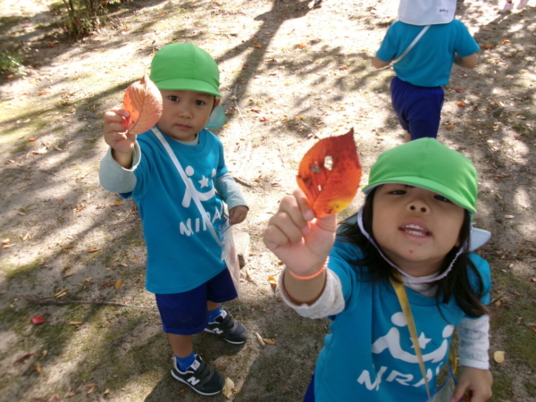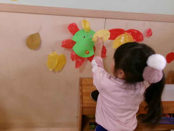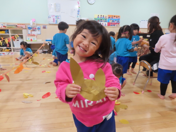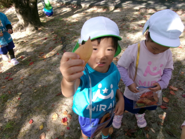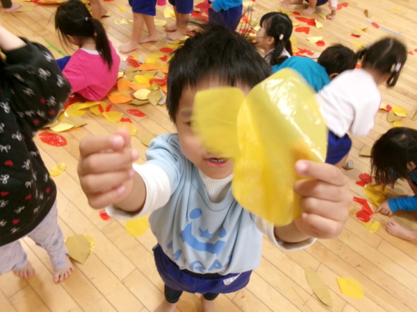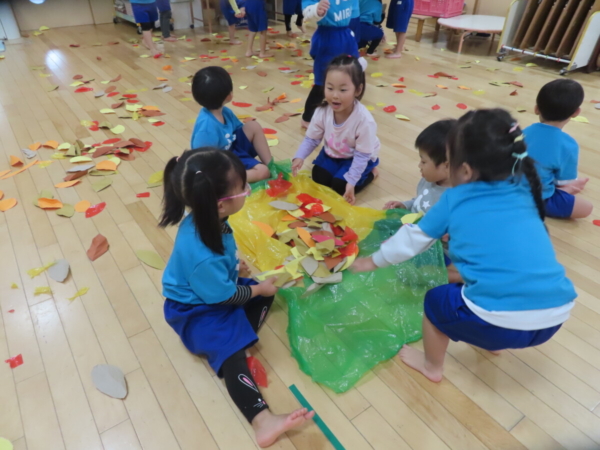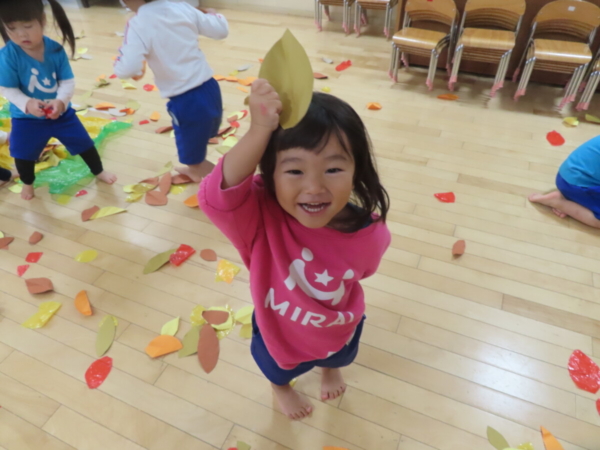 お散歩に行って葉っぱ🍁を拾ったり、ダイナミックに落ち葉の感触を楽しんだり・・・💕パラパラになった葉っぱを使って制作も楽しみましたよ!