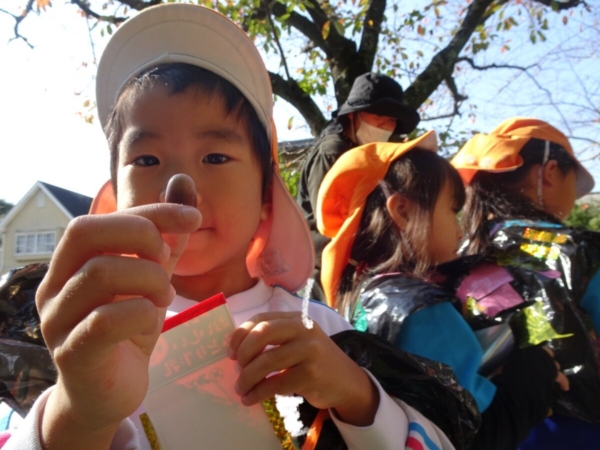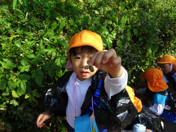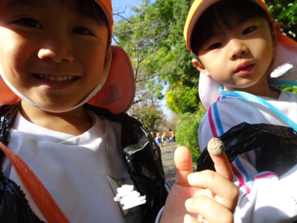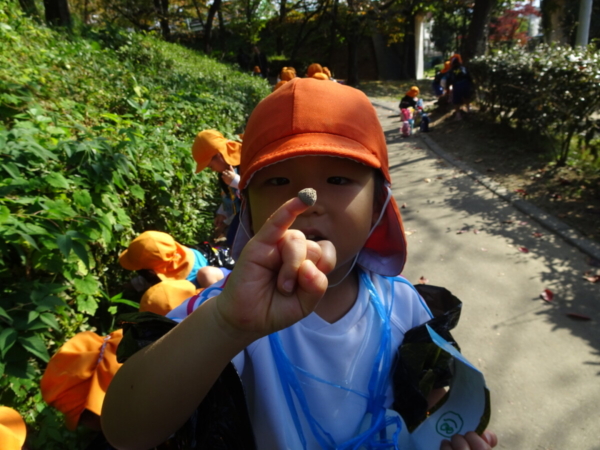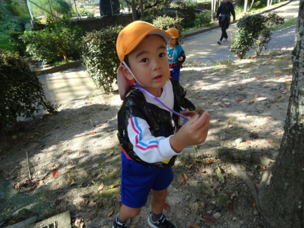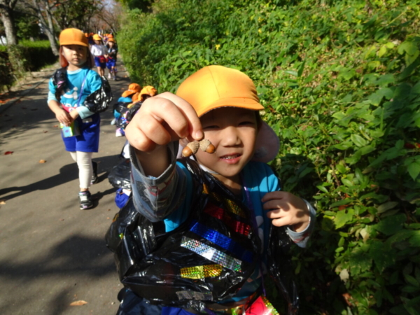 「先生!どんぐりあった🤩」「あ、こっちにも!大きい!!」「どんぐりの帽子だ〜!」とたくさんのどんぐり見ぃつけた👏