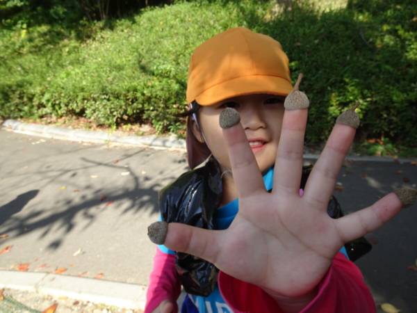 どんぐりんの帽子は指先に着けてみたり、割れたどんぐりは中身を観察したりと思い思いに楽しみました!