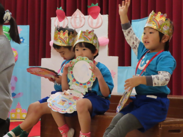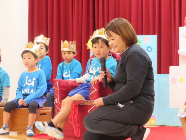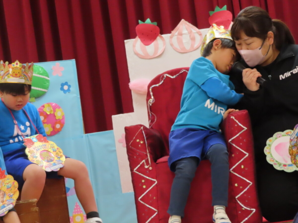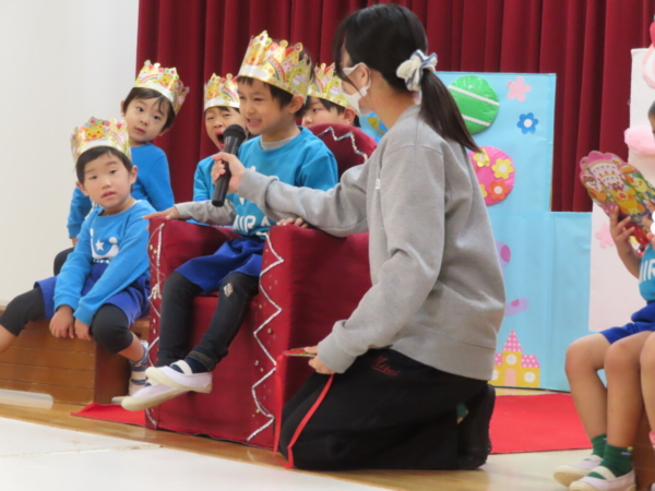 「好きなたべものはなんですか?」「好きなキャラクターはなんですか?」「苦手な食べ物はなんですか?」「得意なことは?」いろいろな質問に答えていくうちに子どもたちも少しずつ分かってきたようで「〇〇先生だ~!!」と大興奮✨