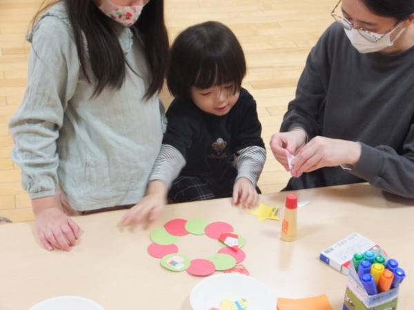 ペンやシール、花紙を使ってリースの飾り付けをしました!!