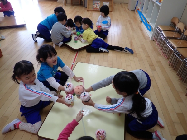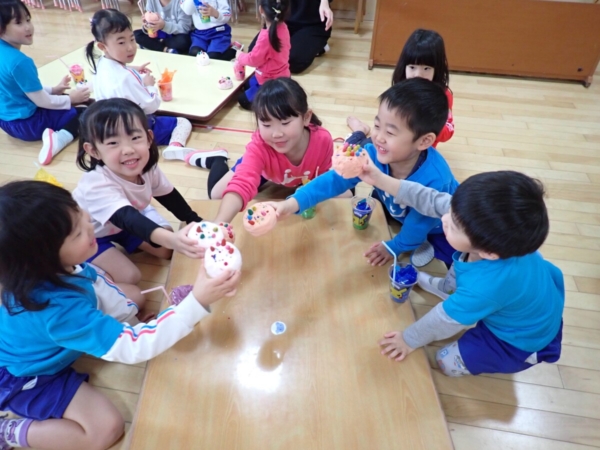 「かんぱ~い!!」と・・・ジュースではなく、ケーキ(笑)😂可愛い✨✨