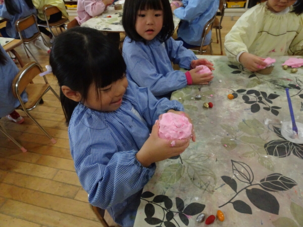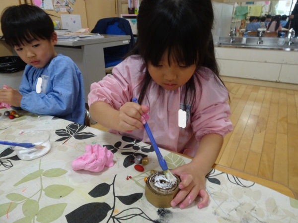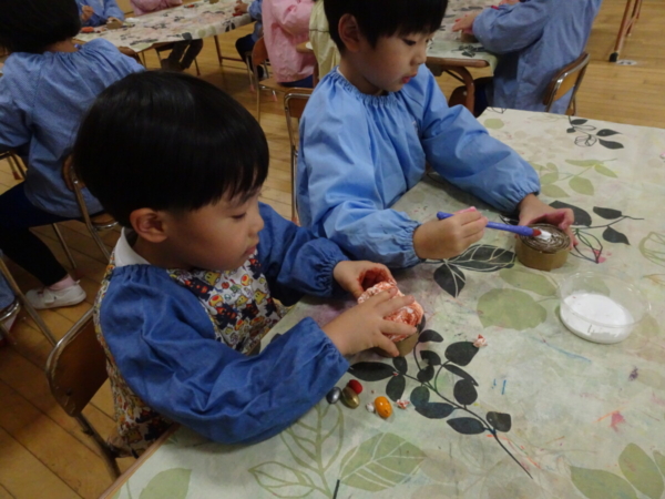 紙粘土と絵の具、どんぐりを使ってチョコレートケーキ🍫やいちごケーキ🍓を作りました。