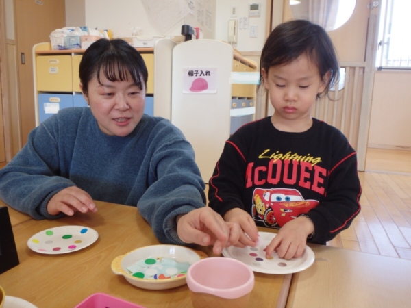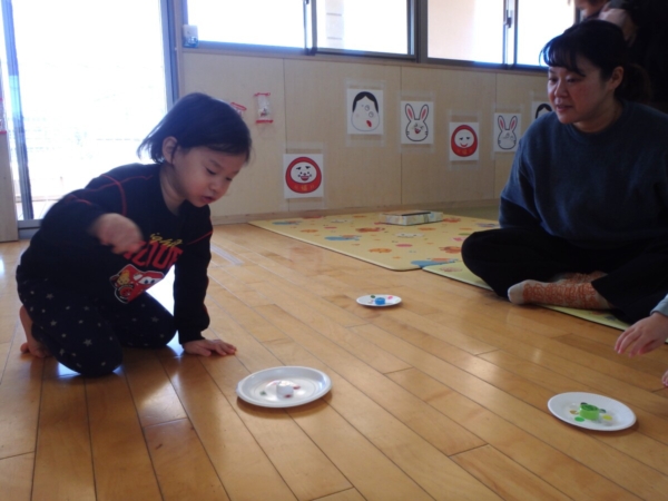 1月は『お正月遊び』として紙皿でコマを作って遊びました🌀