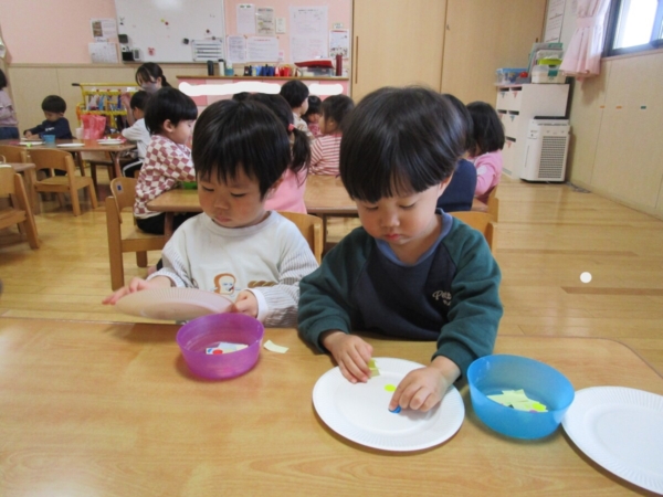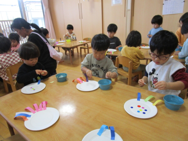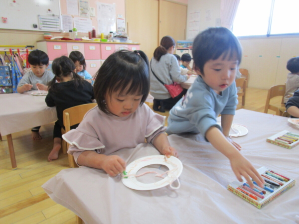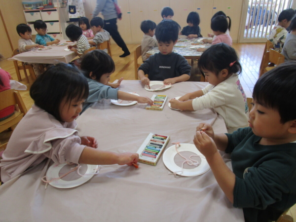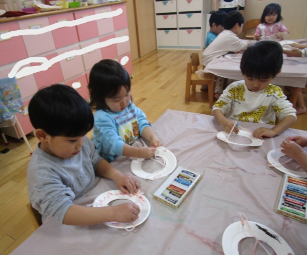 今日は紙皿を使って「凧」作りです