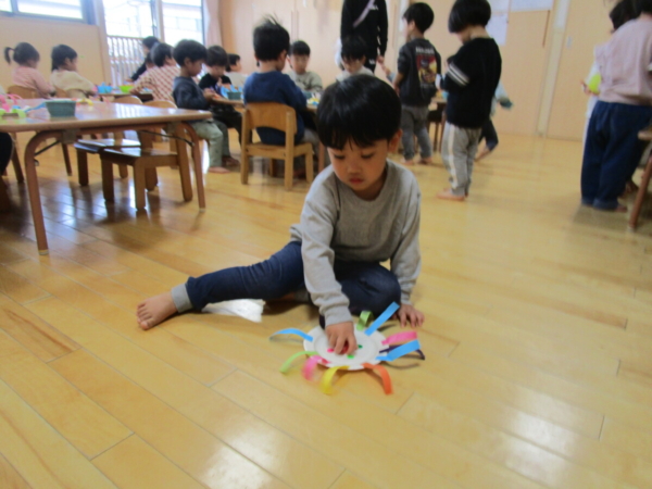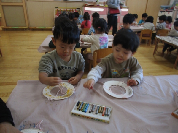 今日は紙皿で「こま」作りです。