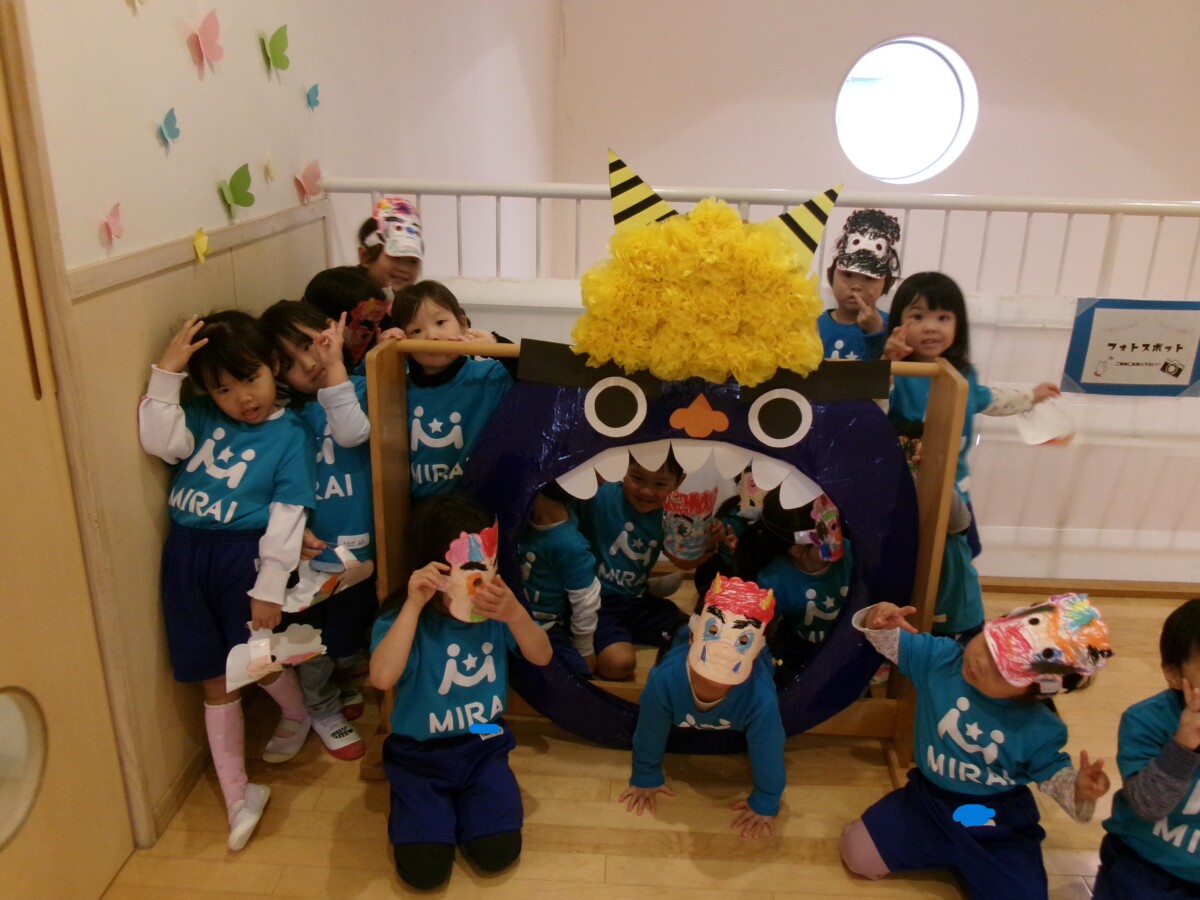 完成したお面をかぶってお散歩をしていると豆まきをしていたいちご組さんともも組さんに出会いました💖