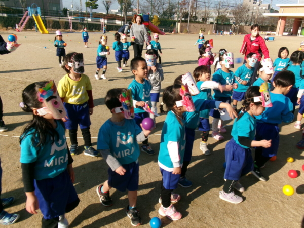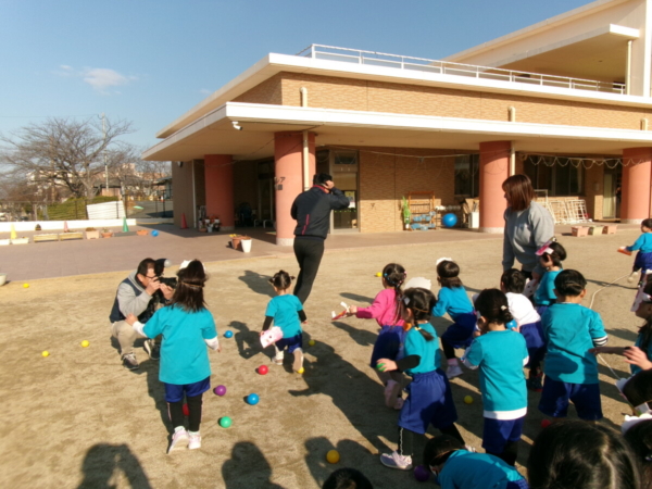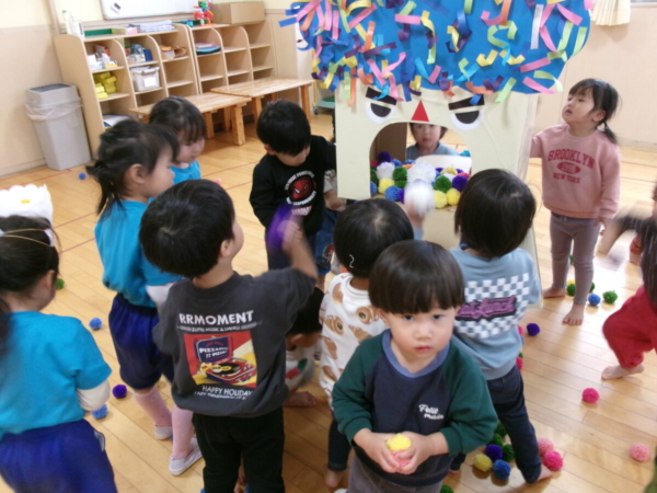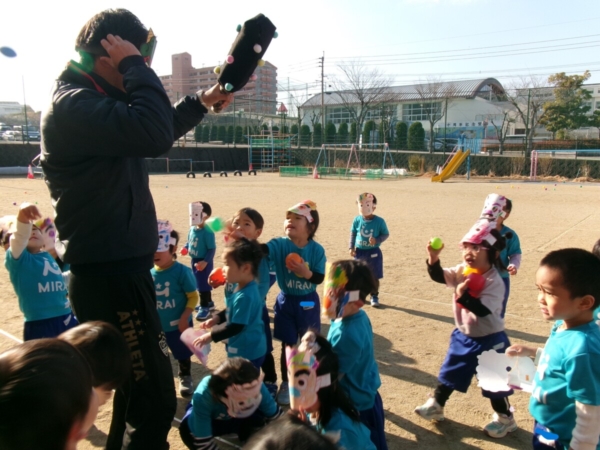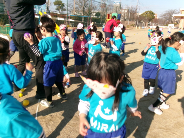 お面をかぶって園庭に出ると鬼(藤田先生)が!みんなでボールを持って大きな声で「鬼はそと~ 福はうち~」と言えました!