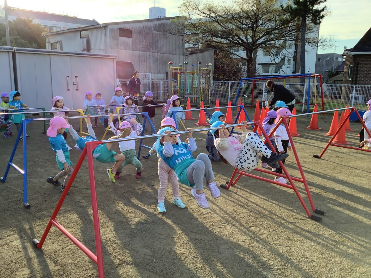 と先生の声で鉄棒にぶら下がり、