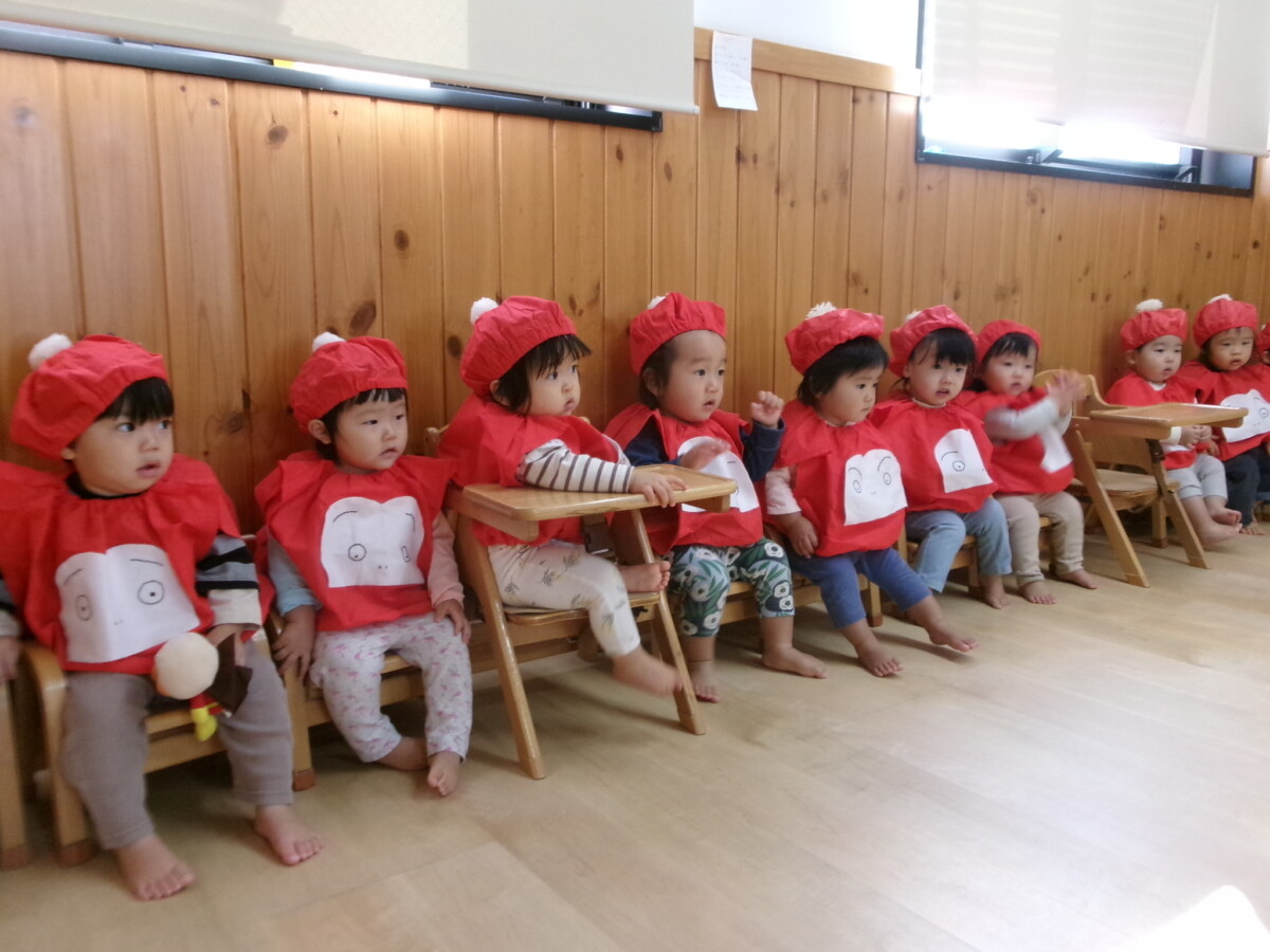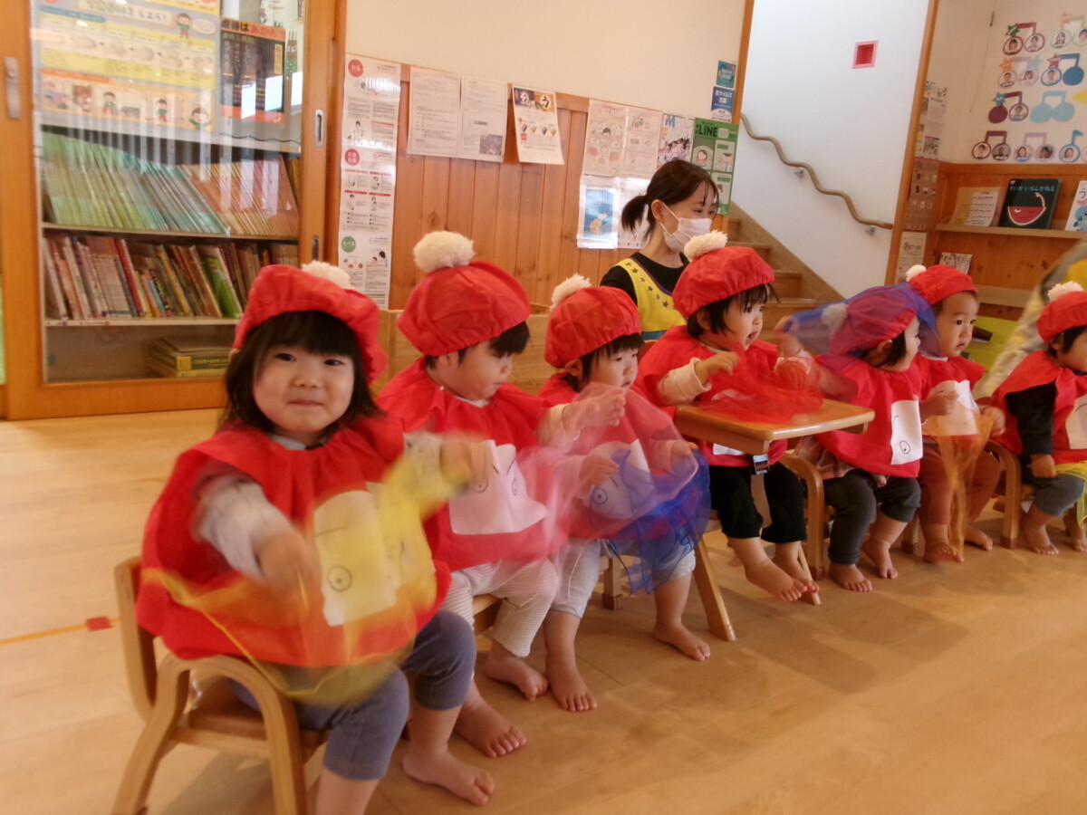 ひかり組は、いつもしている朝の会の場面や手遊び、子どもたちの大好きな絵本「だるまさんが」の表現遊びを発表しました。