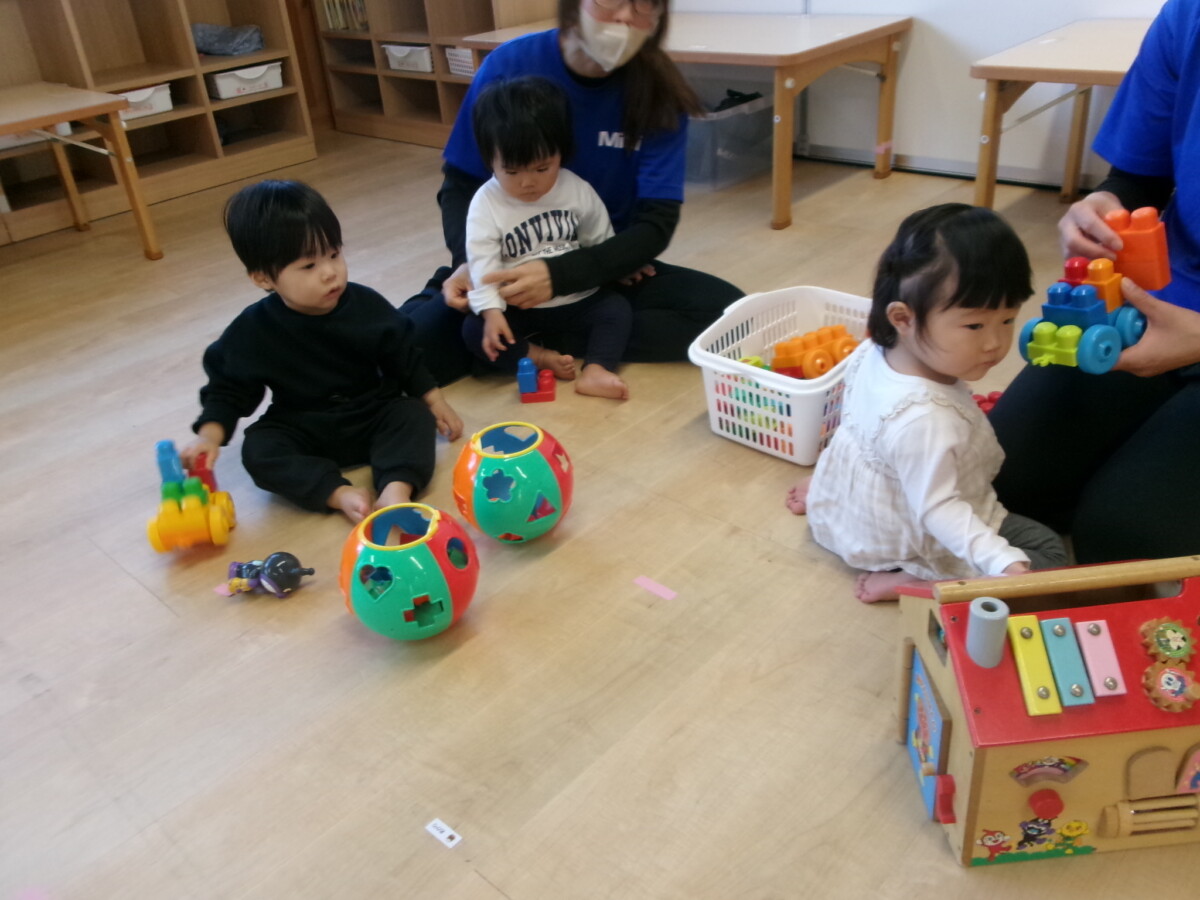 今日は朝の登園時から”なにかがいつもと違う?!”と警戒心プンプンの子どもたちでしたが、控え室に用意したいつも遊んでいるおもちゃをみると