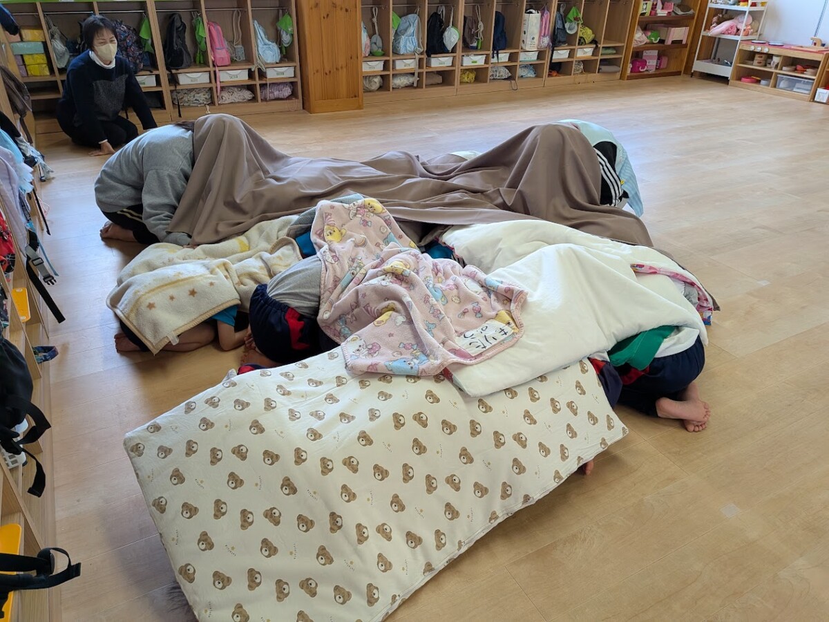 地震発生を知らせる放送が入り、避難訓練が始まります。