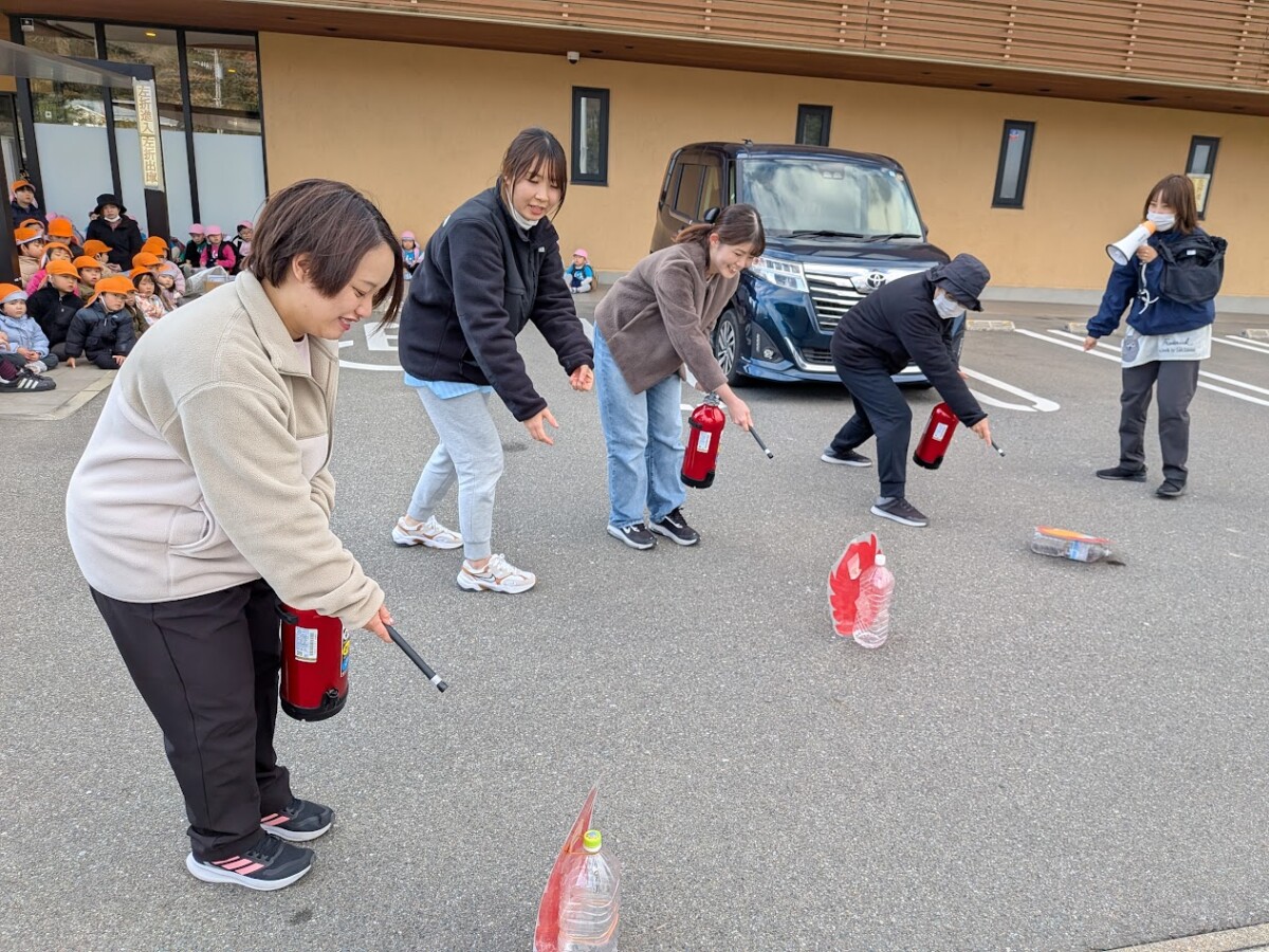地震により、園内の調乳室で火災が発生したという想定で園内の火災報知器が鳴り、消火器を持ち火災報知器