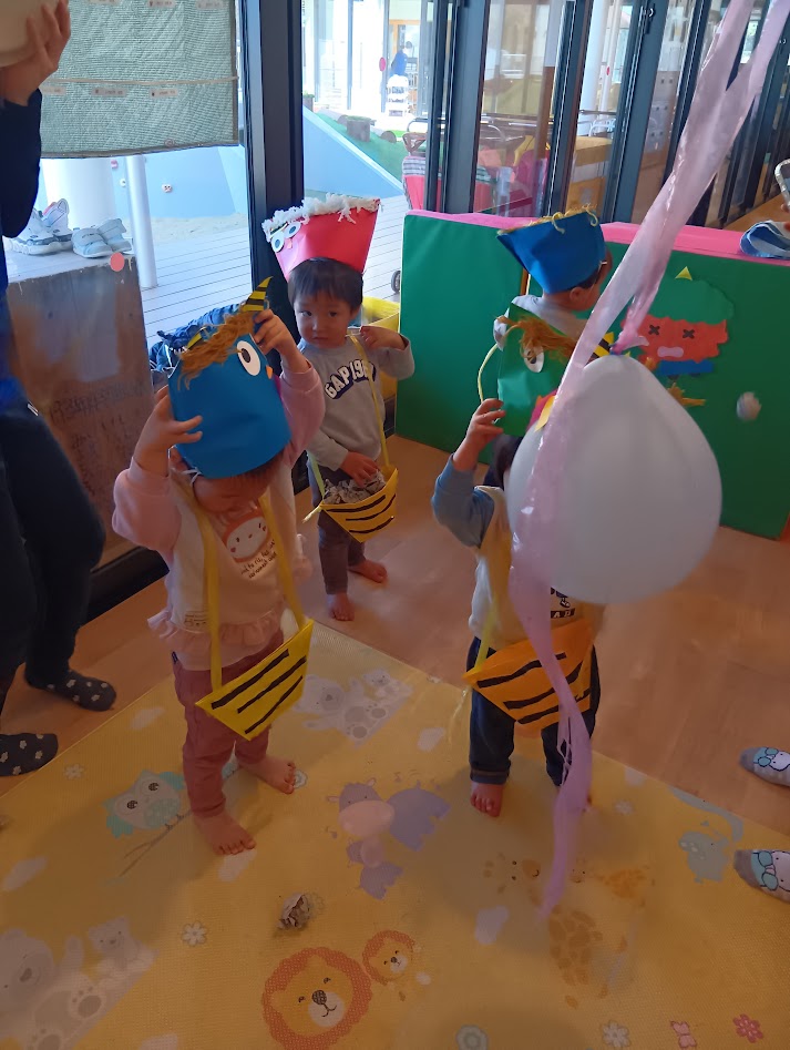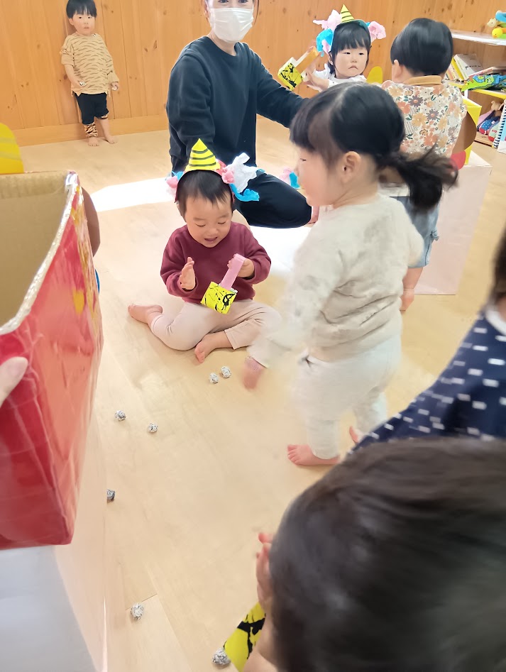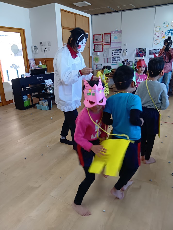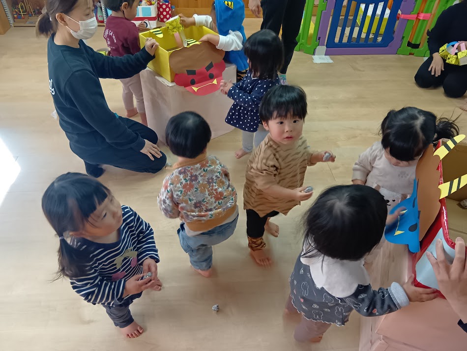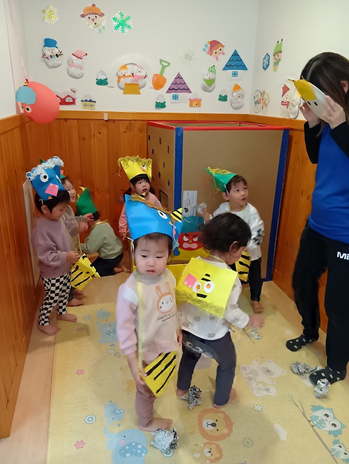 お誕生会が終わり各クラスに戻り、未満児さんはお部屋で豆まきを楽しんでいると・・・・・