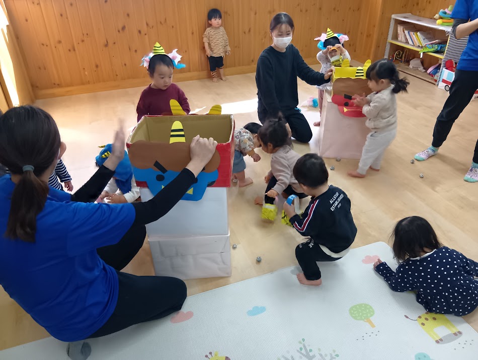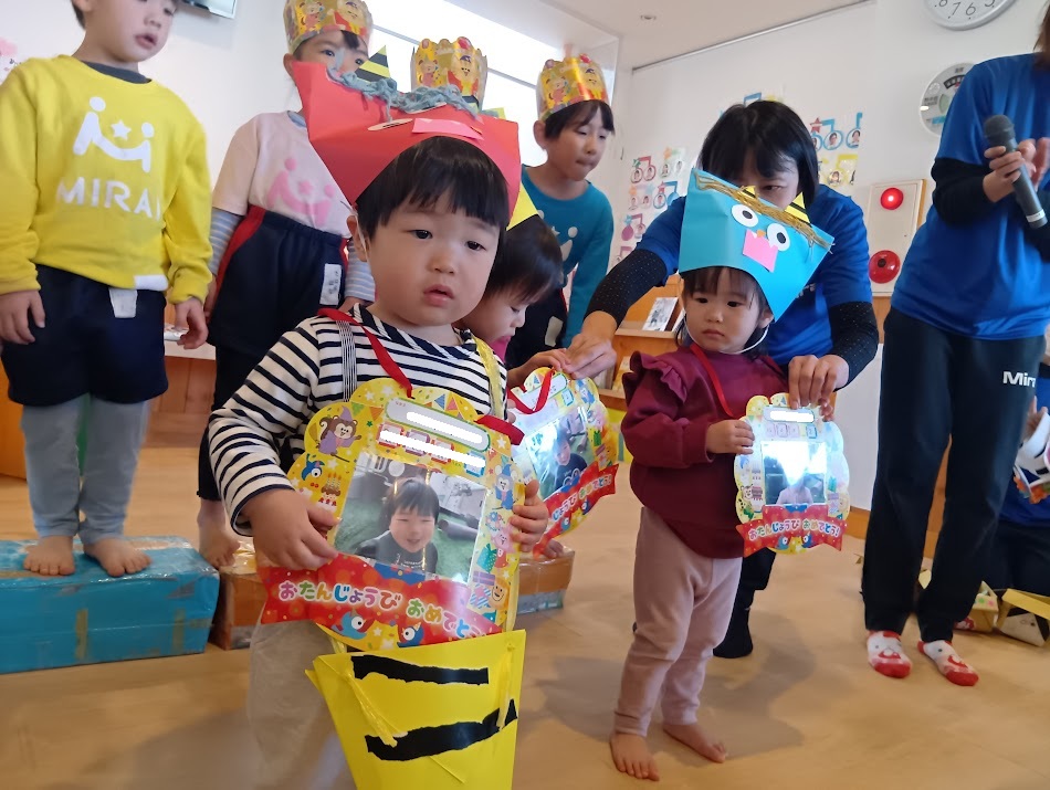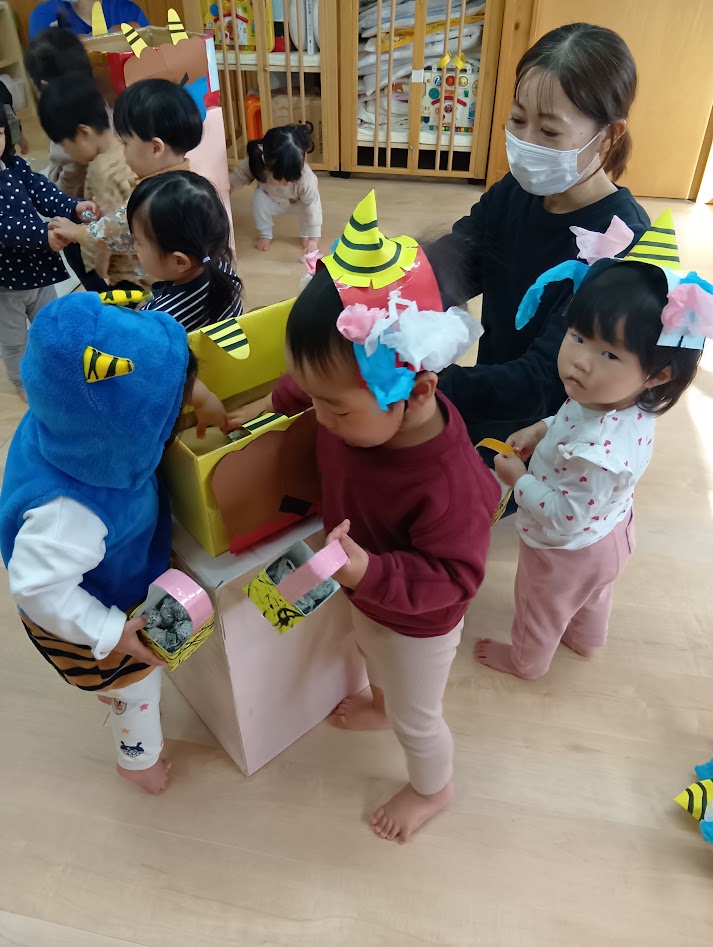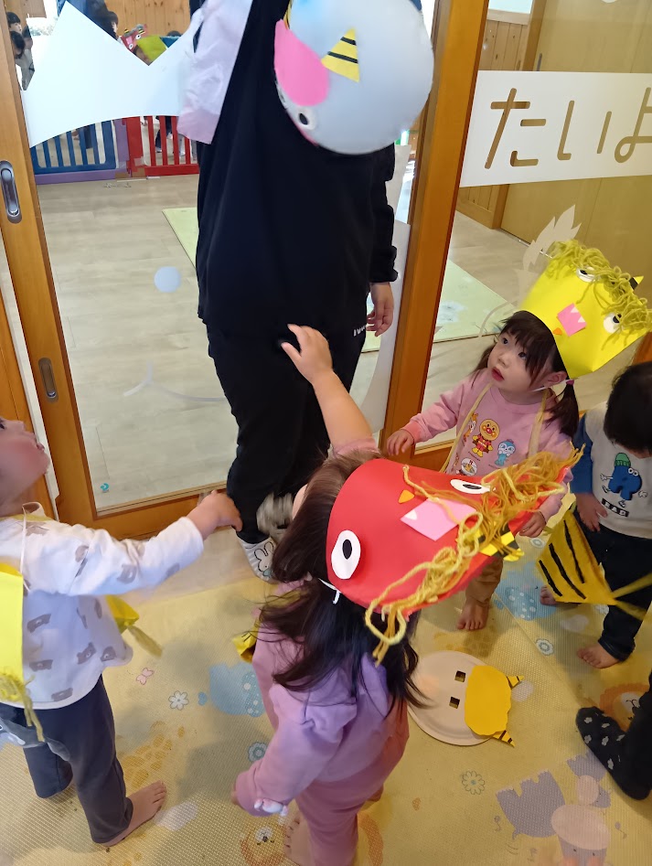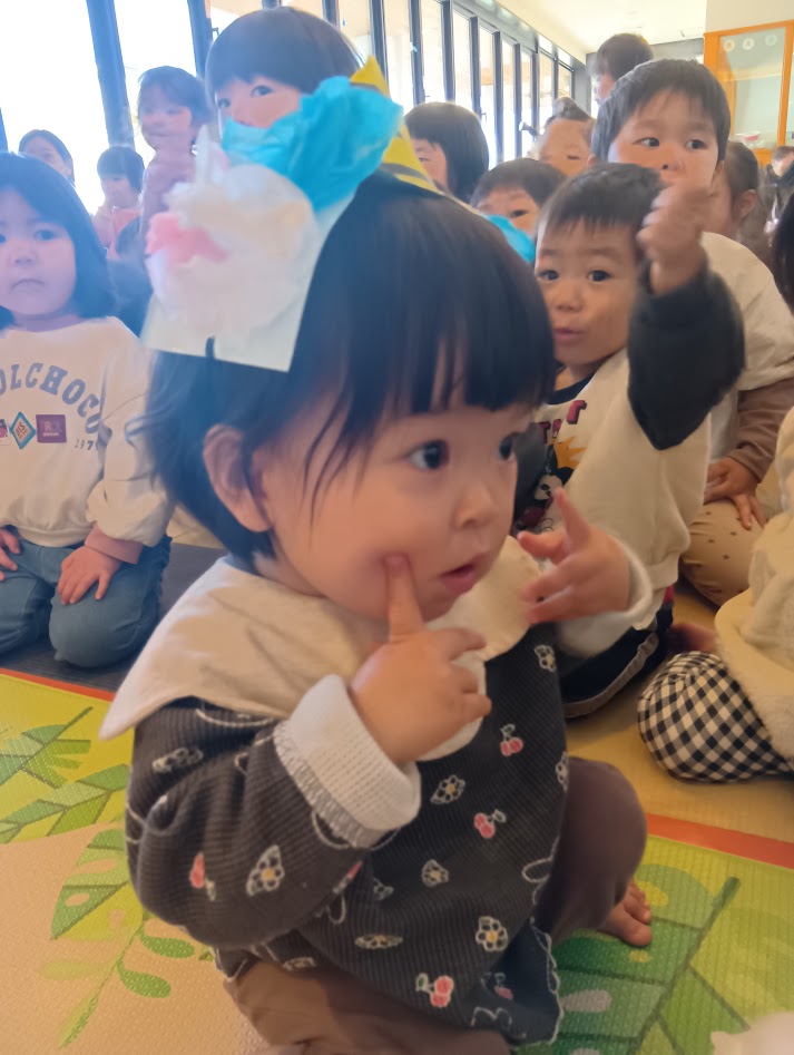 お誕生会が終わり各クラスに戻り、未満児さんはお部屋で豆まきを楽しんでいると・・・・・