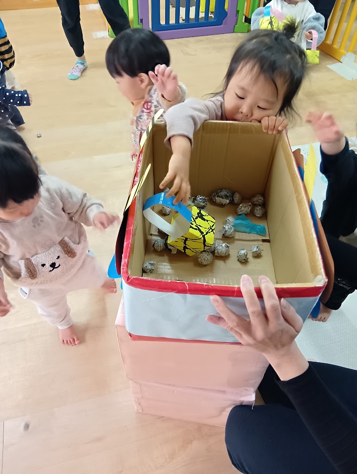 今月の先生の出し物は「びっくり桃太郎」のペープサートです🍑