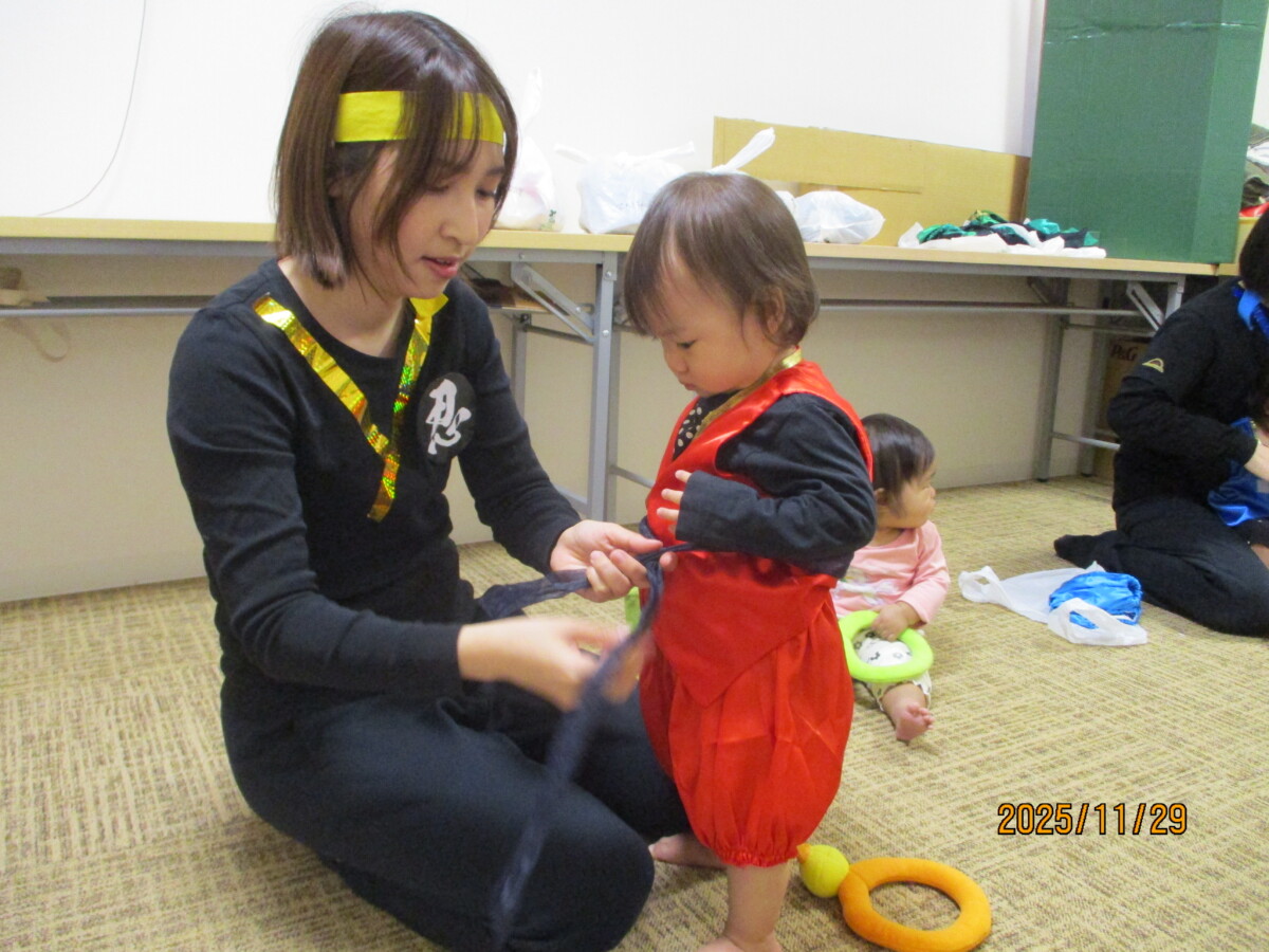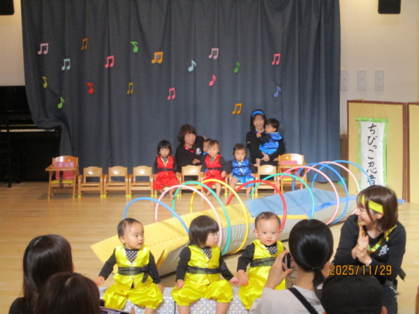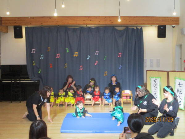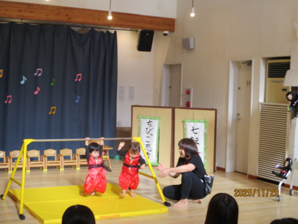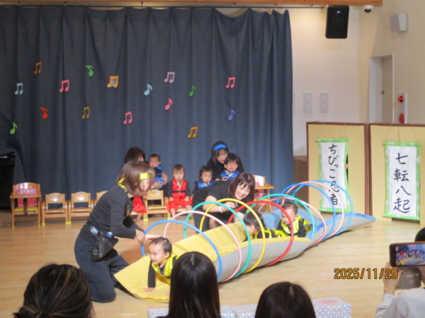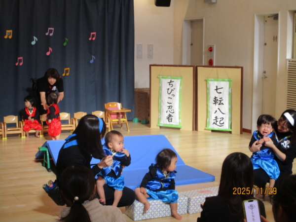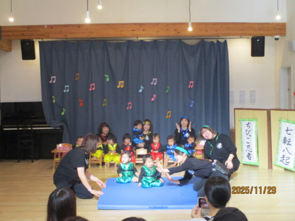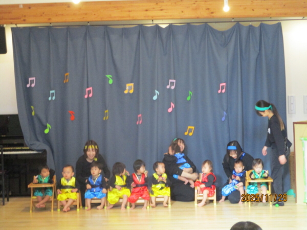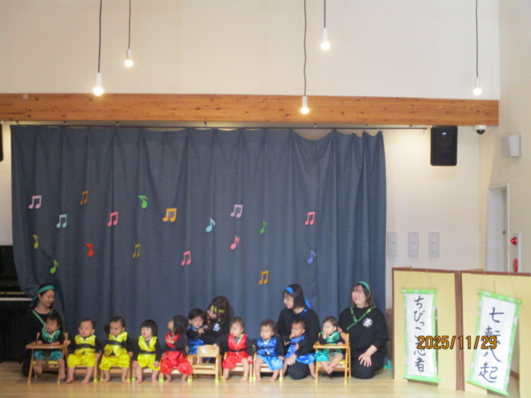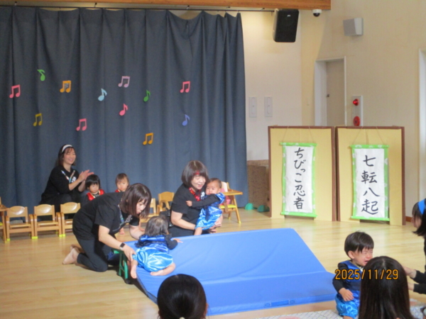 舞台は上府あおぞらこども園のホールです。どうやらちびっこ忍者が修行に出るそうですよ。