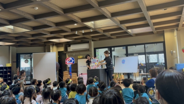 ばけちゃまの出すクイズの答えがわかると、大きな声で「うま!イルカ!」と口々に答える子ども達。
