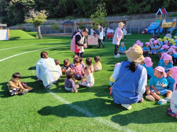 お部屋にいたさくらんぼさんも、お外に落ち着いて避難し、バギーに乗っていたももぐみさんも園庭に避難できました!🌟