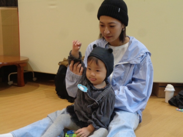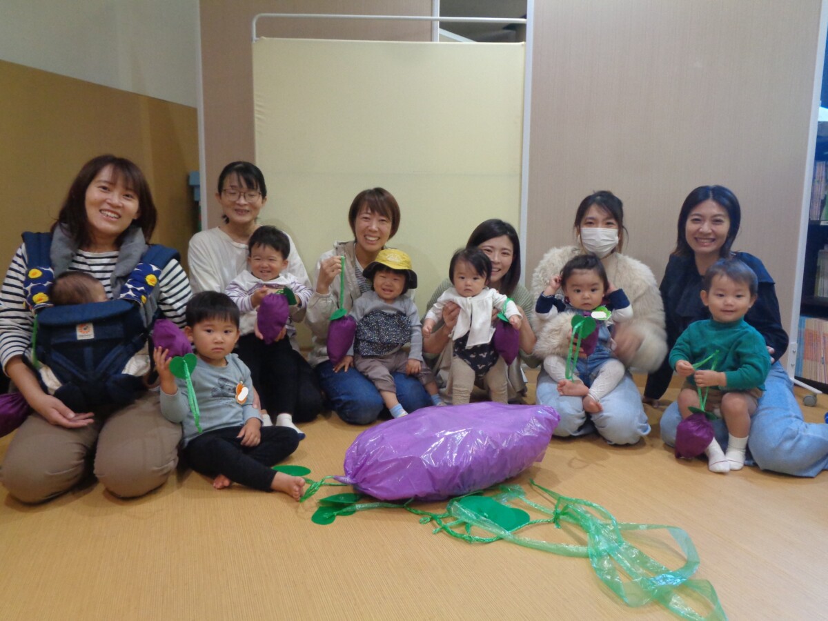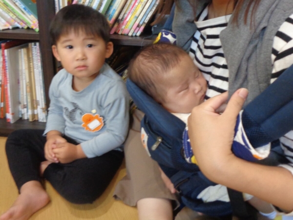 おうちの人の膝の上に座って、ふれあい遊び『おすわりやーす』『うまはとしとし』をして『どんぐりころころ』を歌った後は、『このこどこのこ』に合わせてお名前呼びをしましたよ🤗