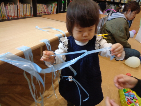 お部屋には緑や白のテープが貼られていたり、水色のスズランテープが暖簾のようになっていたり、フープにもクモの巣のようにテープが貼られていたり…😲そこにたくさんのボールをくっつけたり、スズランテープを裂いたりクリップで挟んだりして、手先指先を使って遊びましたよ👍みんな大好きポットン落としもたくさんしました💕
