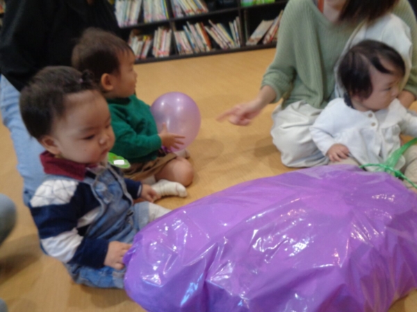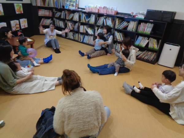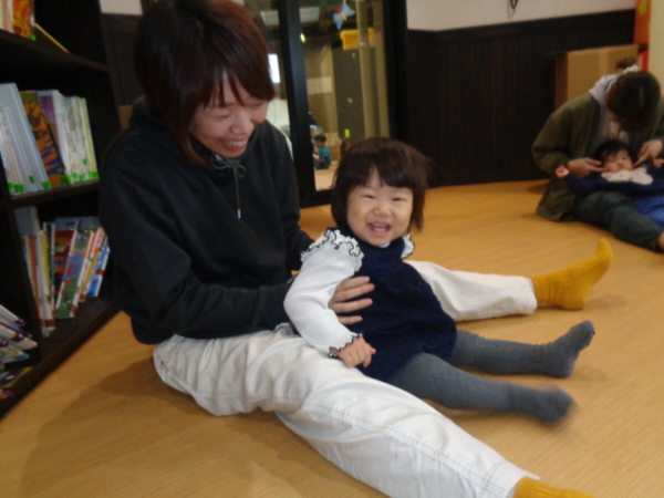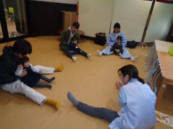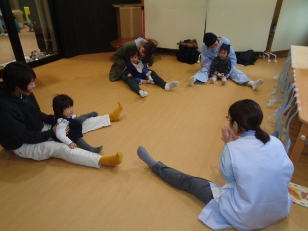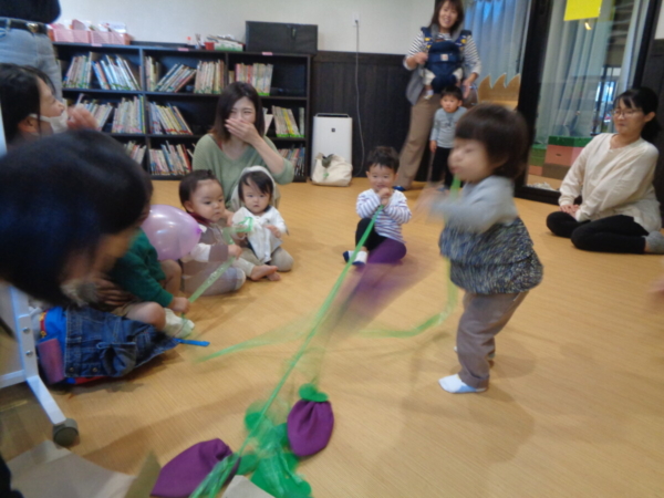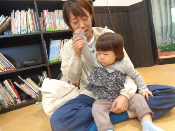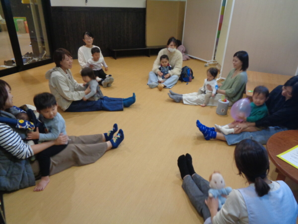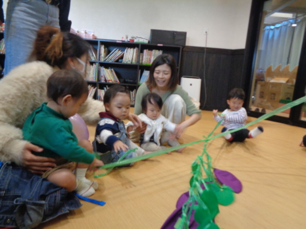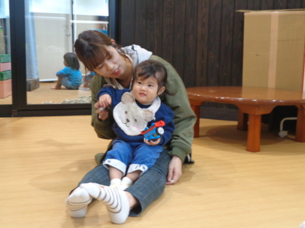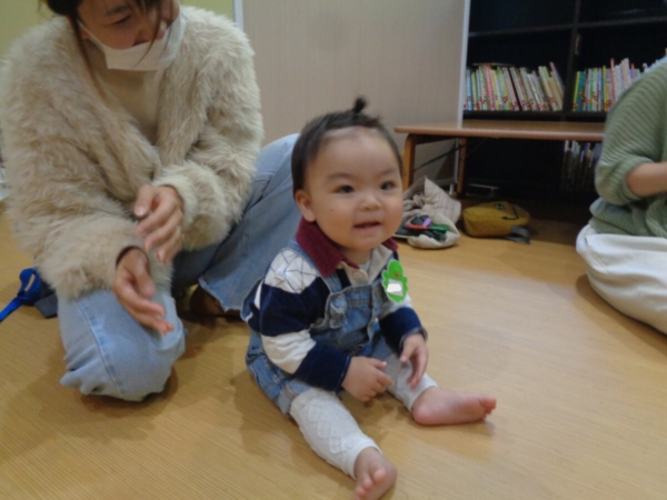 おうちの人の膝の上に座って、ふれあい遊び『おすわりやーす』『うまはとしとし』をして『どんぐりころころ』を歌った後は、『このこどこのこ』に合わせてお名前呼びをしましたよ🤗
