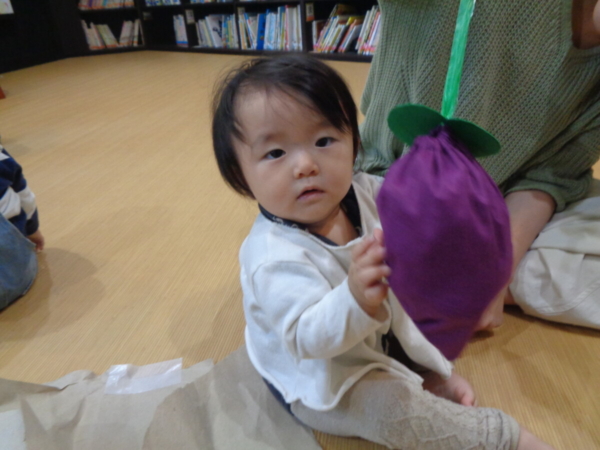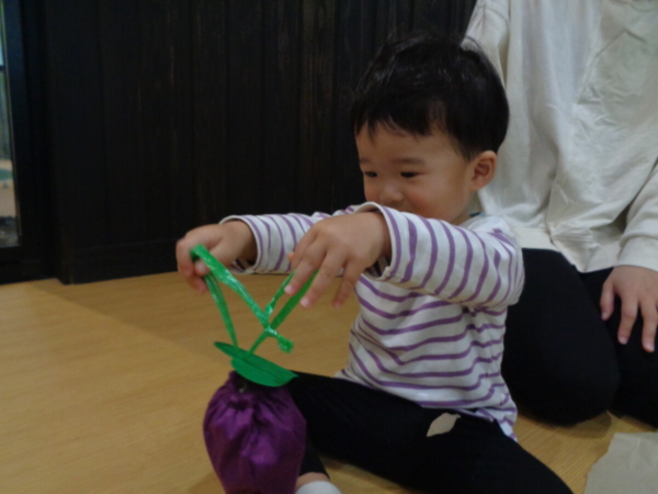 『いもほりよいしょ』の絵本を見た後は、みんなで力を合わせてお芋ほり!!🍠✨「うんとこしょどっこいしょ」とツルを引っ張ると、小さなお芋がゾロゾロ…そして最後は大きなお芋が!!😄小さなお芋には紙をビリビリ破いたり丸めたりしたものを詰めて、可愛いお芋巾着の出来上がり💕みんな、真剣に詰め込んでいましたよ✨
