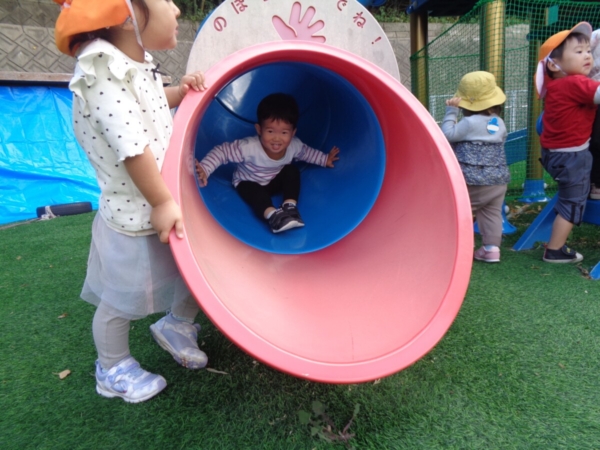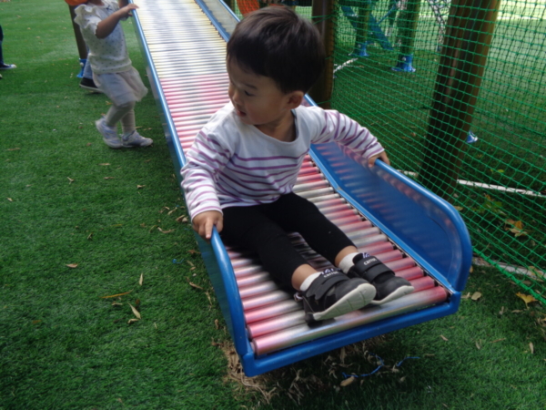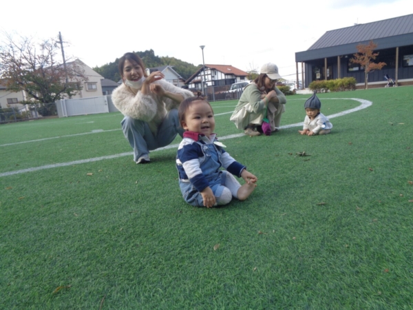 少しだけお外でも遊びましたよ🎵こども園のお友だちに混ざって、大型遊具の滑り台を楽しんだり築山のトンネルを通ったり🌟初めての芝生を堪能するお友だちも😊みんなニコニコ笑顔で可愛かったです💕次回の園庭開放も、たくさん遊びましょうね✨