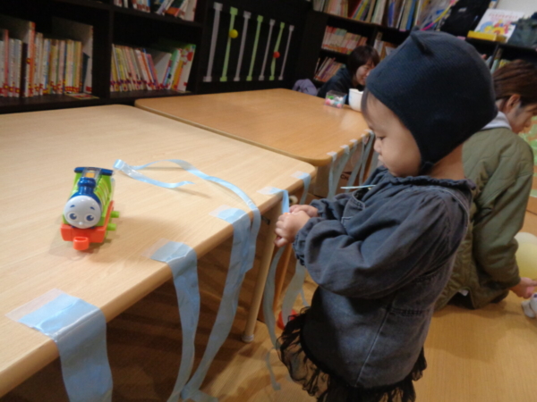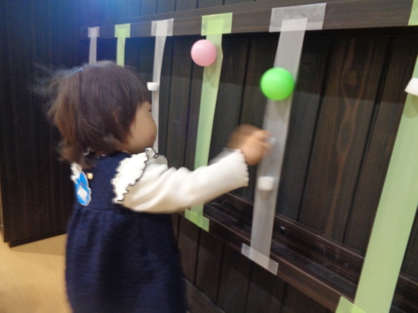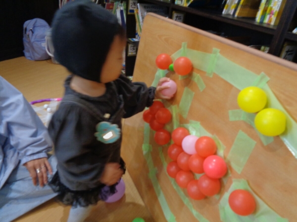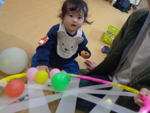 お部屋には緑や白のテープが貼られていたり、水色のスズランテープが暖簾のようになっていたり、フープにもクモの巣のようにテープが貼られていたり…😲そこにたくさんのボールをくっつけたり、スズランテープを裂いたりクリップで挟んだりして、手先指先を使って遊びましたよ👍みんな大好きポットン落としもたくさんしました💕