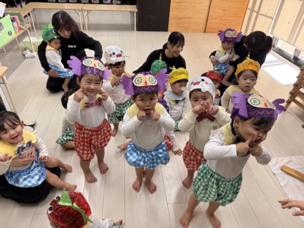 登園してくると、いつもとは違う雰囲気に泣いてしまう子どももいましたが、衣装に着替えると笑顔になり張り切っている様子でした!!