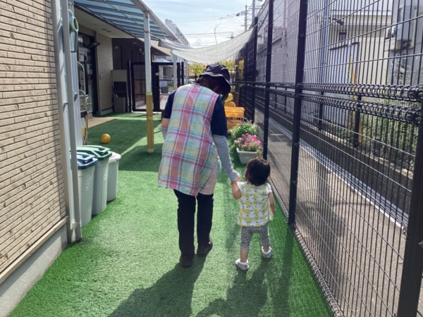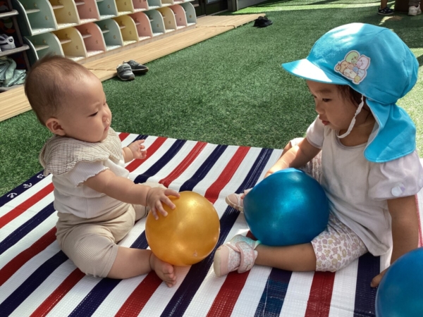 シートに座ってボールで遊んだり、園庭の中を歩いてお散歩したり久しぶりの外遊びを楽しむことが出来ましたよ(*^^*)