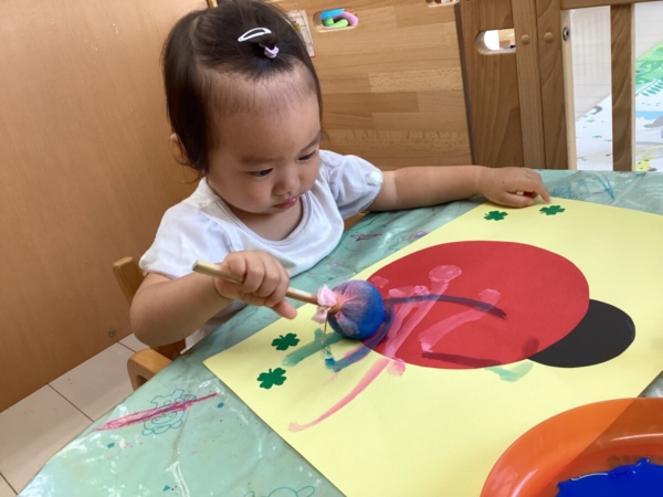 3色絵の具があり好きな色を自分で選びながら、ポンポンと押したり撫でたりしながら模様を描いていきましたよ♪