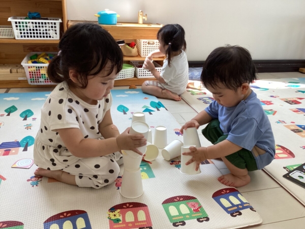 保育者がタワーを作ると、真似して積んだり、重ねたりして遊んでいましたよ♪