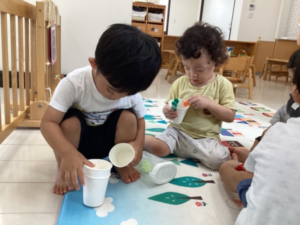 アイクリップを中に入れてジュースにしたり、紙コップを並べてジュース屋さんごっこも楽しんでいました☆