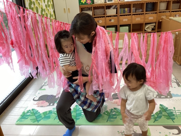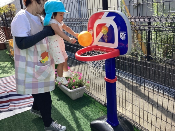 保育者に抱っこしてもらい、上からボールを入れダンクシュート✨
