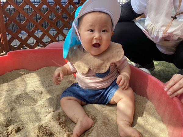 初めて触るお友だちは、さらさらした砂の感触ににこにこ楽しんでいました☆ミ