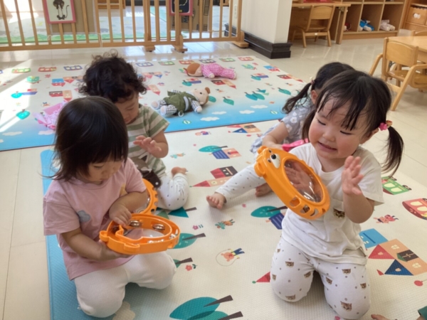 タンバリンを使って、おもちゃのチャチャチャ・山の音楽隊の歌に合わせて叩きました🎹♪