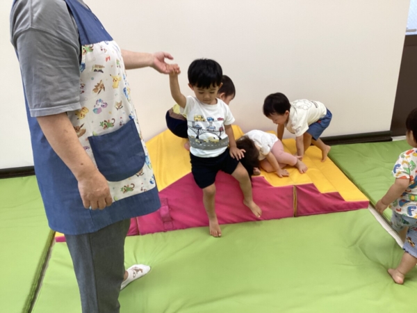 一番高い所から、保育者と手を繋いでジャンプしたり