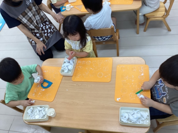 久しぶりの粘土遊びでは、ドーナツ屋さんになりきって小さく切った粘土を