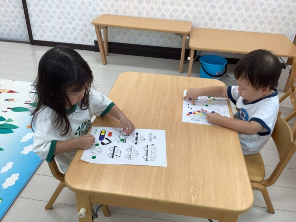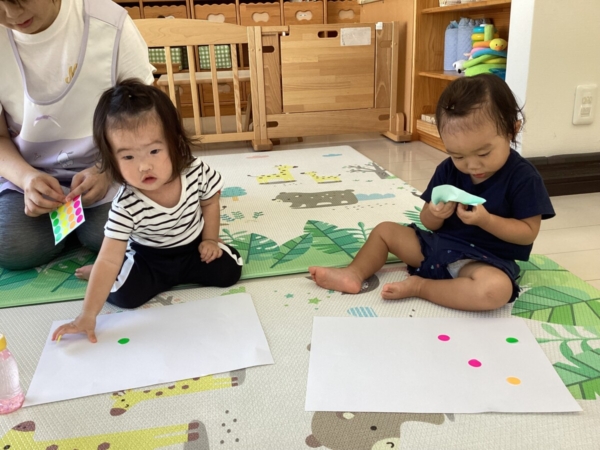 シール貼りをしました。保育者にシールを台紙からはがしてもらい、ペタッと貼ってはにっこりする姿や、真剣な表情で自分ではがして貼る姿が見られましたよ。指先を使うので、たくさん遊んでいきたいです(^^♪