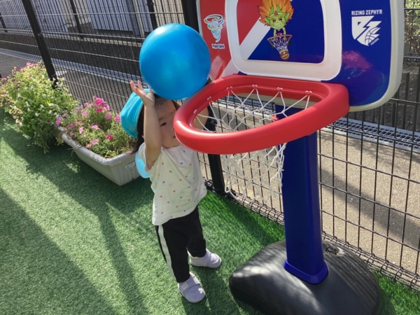 戸外に出ると、自分でボールを取りに行って、バスケットゴールに入れて楽しんでいます!