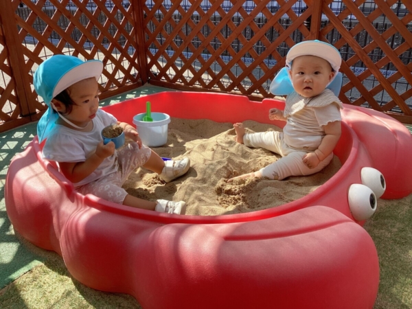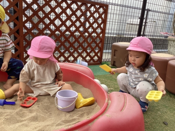 砂場では、カップに砂を入れたり、座って足を動かしながら砂の感触を楽しんでいましたよ(*^^*)