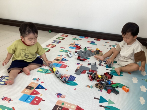 お部屋では自分の好きな遊びに夢中になる様子がたくさん見られます。電車を一列にきれいに並べて押して動かしたり、線路をつなげて組み立てたり・・!車や電車が大好きで毎日とっても楽しそうです(^^♪